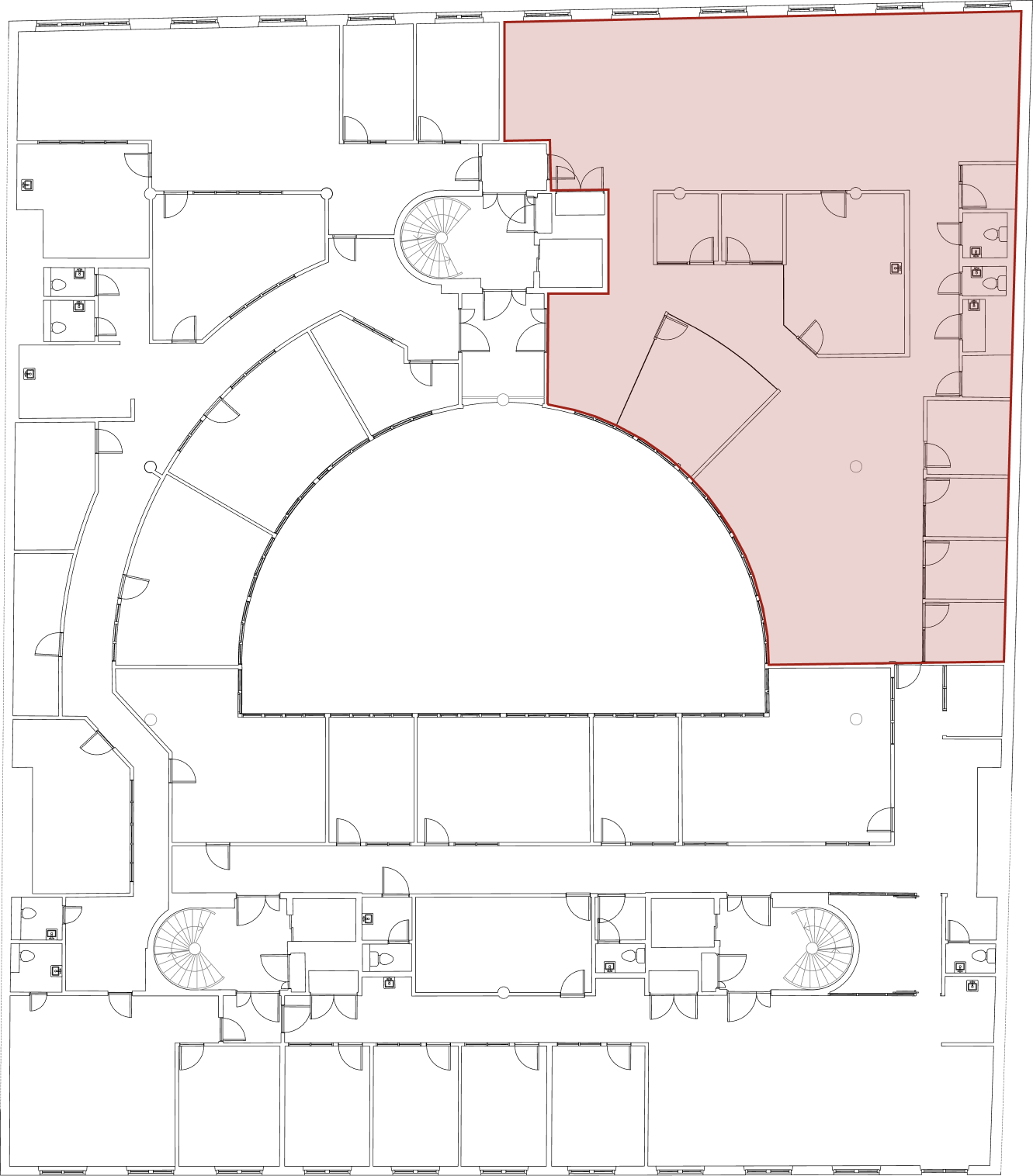 Светлое и хорошо спланированное офисное помещение площадью 286,1 м² на 4-м этаже. Планировка помещения двойного типа (открытый офис и зона с отдельными кабинетами):